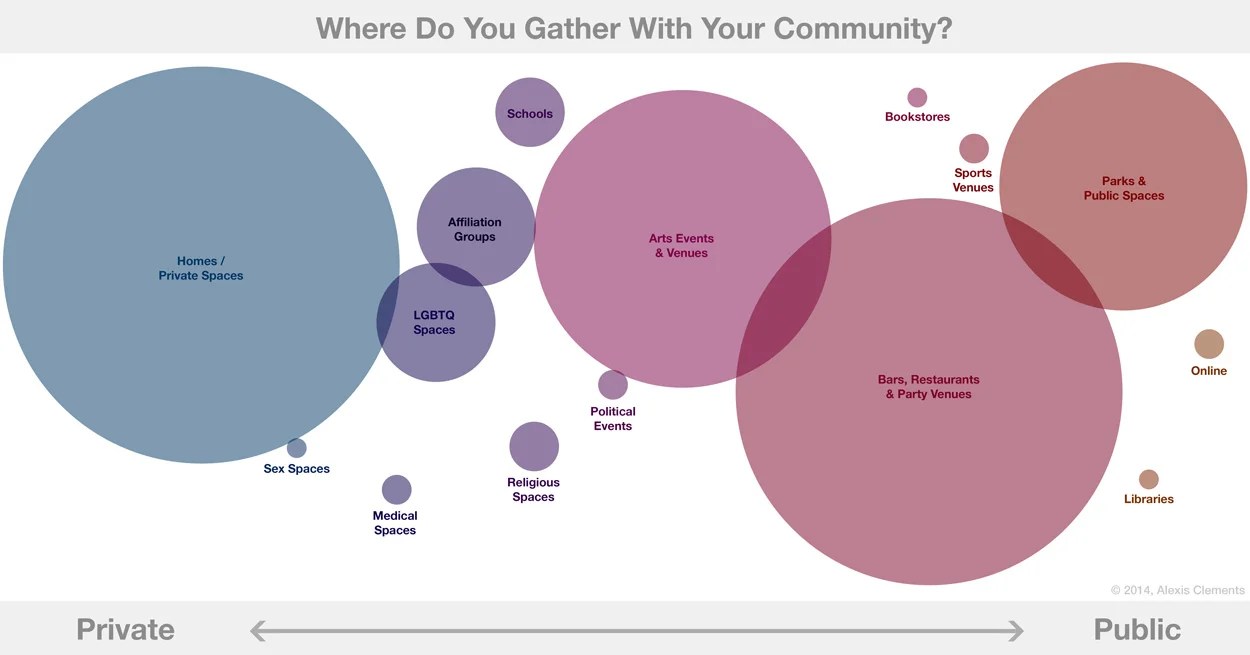The image above is a rough draft of a visualization of the results that I’ve compiled through December 2014 from people I’ve spoken with for the documentary, people who have attended events, as well as donors and supporters of the project. I’ve grouped specific answers into general categories to help simplify the visualization a little bit, and I’m tinkering with how to represent the spaces on a spectrum from very private spaces where you must be invited in to spaces that are entirely open, public spaces.